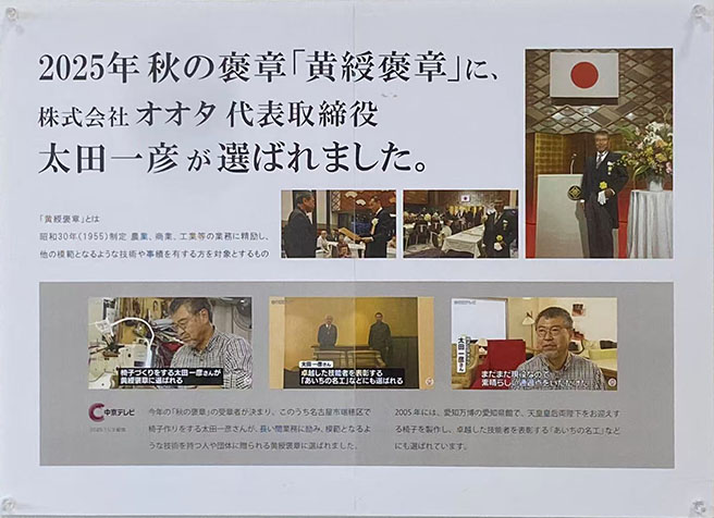 そして昨年春に、全日本椅子張同業組合連合会の種澤理事長より黄綬褒章の推薦をいただき、この度の受章となりました。