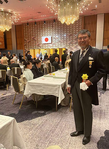 11月12日には東京で厚生労働大臣から章記・褒章の伝達をうけ、引き続き皇居へ参内して天皇陛下に拝謁、式典の最後には陛下から直接お声掛けの栄を賜り、感激の極みでございました。