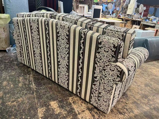 生地の縦のラインが美しく揃うよう、背もたれ・座面・脚部と、それぞれ意識して慎重に張り替えました。